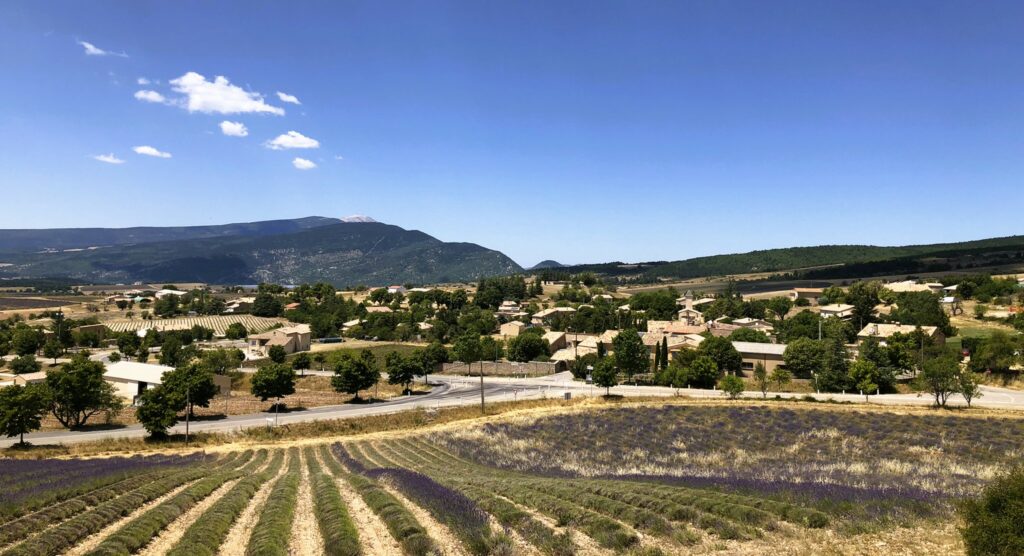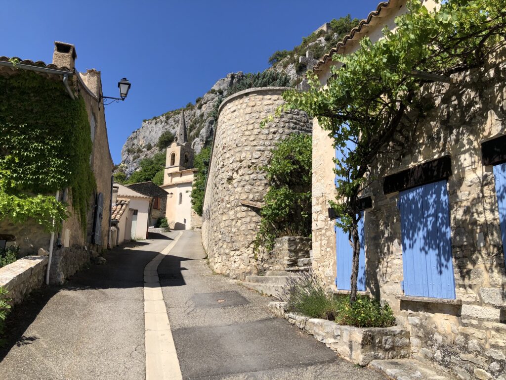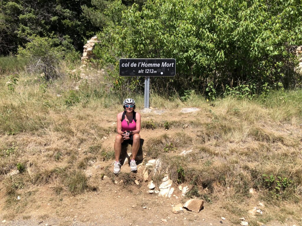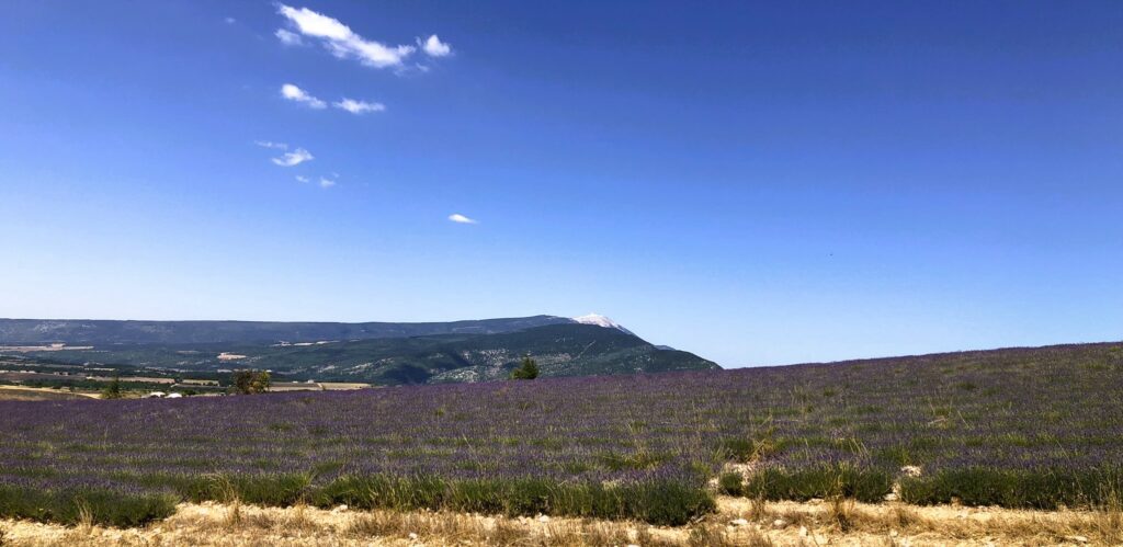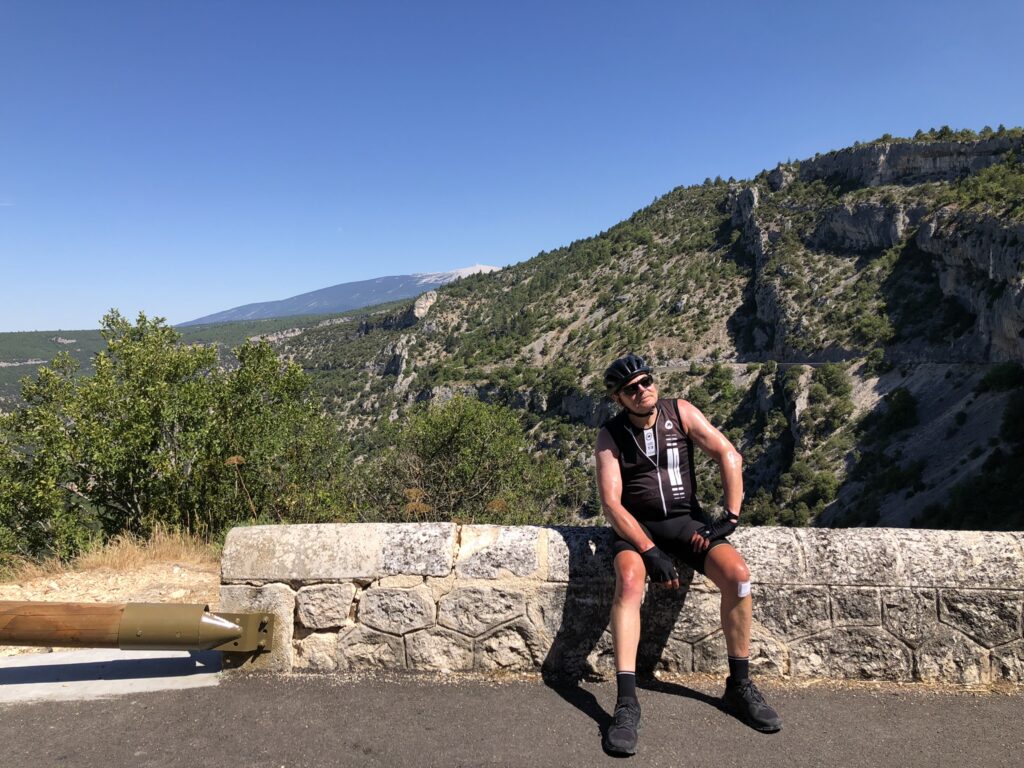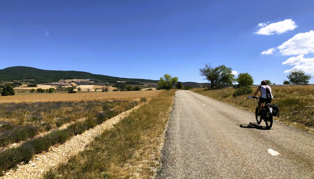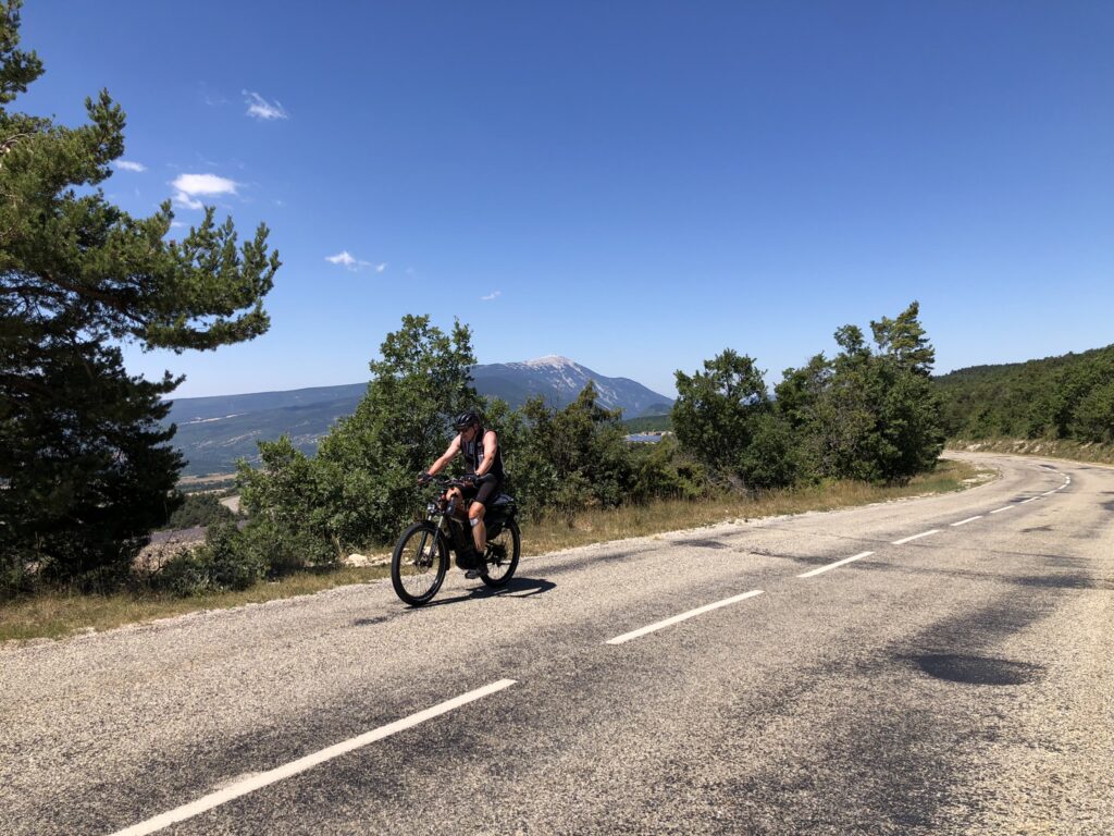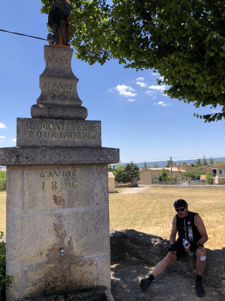 Wat is het hier ontspannend, geen gejaag en alles op het gemak. Vandaag reden we Col de l’Homme Mort op via de Nesque, Sault, Ferrassières. In het begin ging het fietsen heel vlot maar bij de beklimming van de “Col de l’Homme Mort” kreeg snoek het moeilijk. Moe en beetje oververhit. We reden nog even verder tot we uitzicht hadden op “Barret-du-Lioure” en zagen de Alpen in de verte! We fietsten terug via dezelfde weg en stopten even in Ferrassières. Niet ver van het kerkje is er een fontein en een bank om even te rusten. Tijdens het dalen had JM terug een bij steek gehad. Ik kon het gif uitzuigen. We daalden verder naar Aurel en van Aurel reden we naar Sault om te eten want na 65 km en klimmen hadden we honger. Mooie dag. Het wordt hier komende dagen heel erg warm, tot 38 graden.